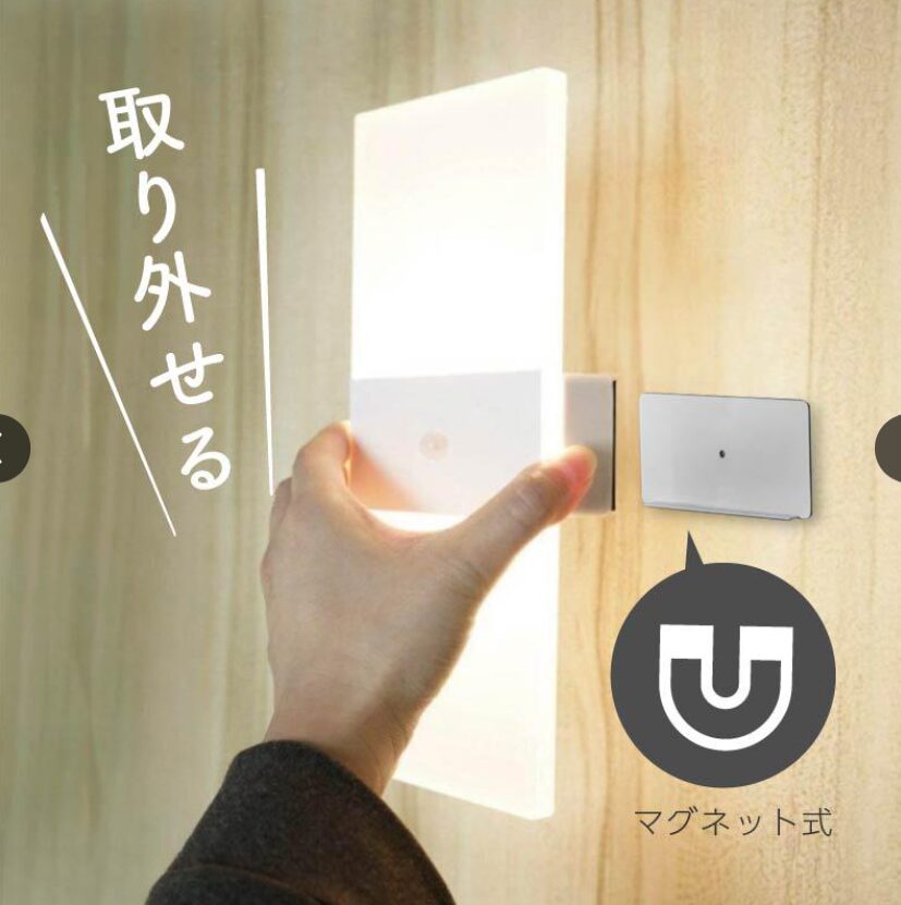 また、「LEDモバイルライト(WML01)」のように、持ち運びが可能で、充電式、かつ壁掛け用のフック穴が備わっている製品もあります。これを石膏ボード用のピンフックに引っ掛けるだけで、簡単に壁付け照明として使用できます。
