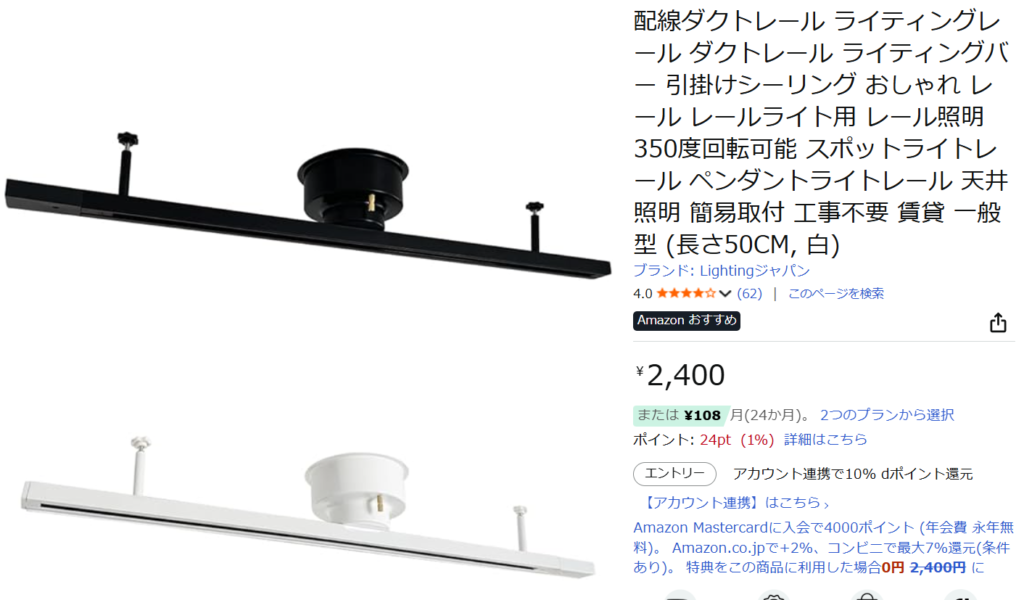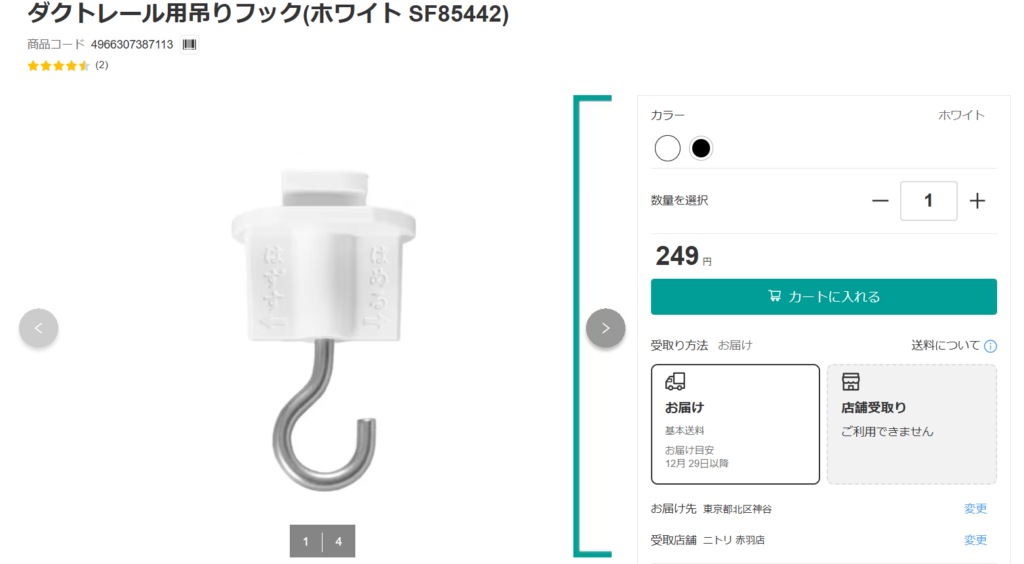 ニトリのダクトレール関連製品は、主に照明セットの一部として販売されていることが多いですが、単品でのフックの取り扱いもあります。
