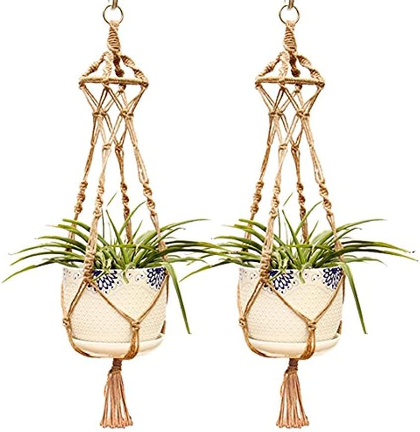 植物を吊るす際、全ての高さを揃えてしまうと、どこか窮屈で単調な印象になってしまいます。そこで活躍するのが、長さの違う麻紐や、100均でも手に入るマクラメ編みのハンギングネットです。