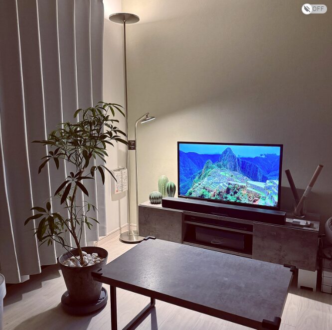 また、サイドに付いているアーム式の読書灯(350ルーメン)も非常に優秀です。アップライトで空間全体のトーンを作りつつ、手元だけをピンポイントで照らせるので、ソファでの読書やスマホ操作が驚くほど快適になります。光の色味も2700ケルビンの温かみのある電球色なので、夜のリラックスタイムには最適ですね。