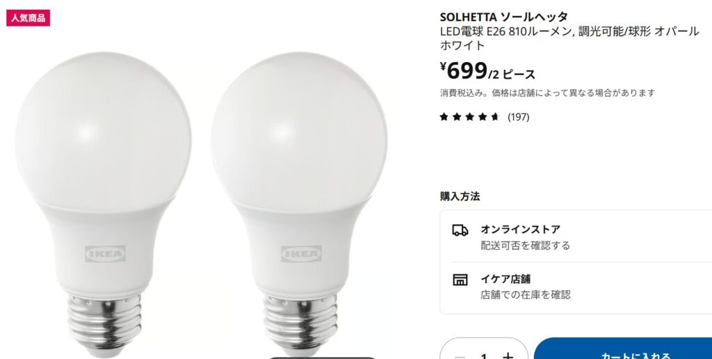 「安くて良い電球」を探しているなら、ダイソーだけでなくIKEA(イケア)やニトリも非常に強力なライバルです。特にIKEAのLED電球「SOLHETTA(ソールヘッタ)」シリーズは、私たちの界隈ではかなり話題になるほどコスパが良いんです。