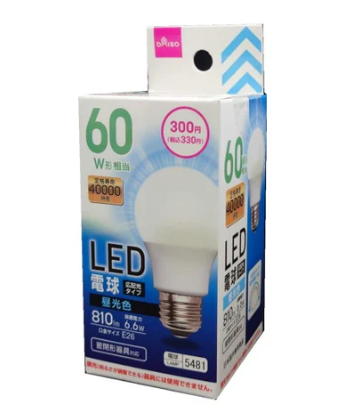 こちらは洗面台やキッチンの手元灯など、しっかりと明るさが欲しい場所に最適ですね。ただ、60W形はダイソー製品の中でも少し筐体が大きめなものもあり、取り付けたい器具に入るかどうかは事前にチェックしておいたほうがいいかもしれません。