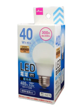まずダイソーの店舗に足を運ぶと、照明コーナーには「40W形相当」と「60W形相当」の2種類が主軸として並んでいます。