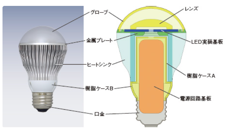 LEDは光自体には熱をほとんど含みませんが、電気を光に変える際に内部で大量の熱が発生します。その熱を外に逃がして、LEDチップが焼き切れるのを防いでいるのがこの放熱部なんです。