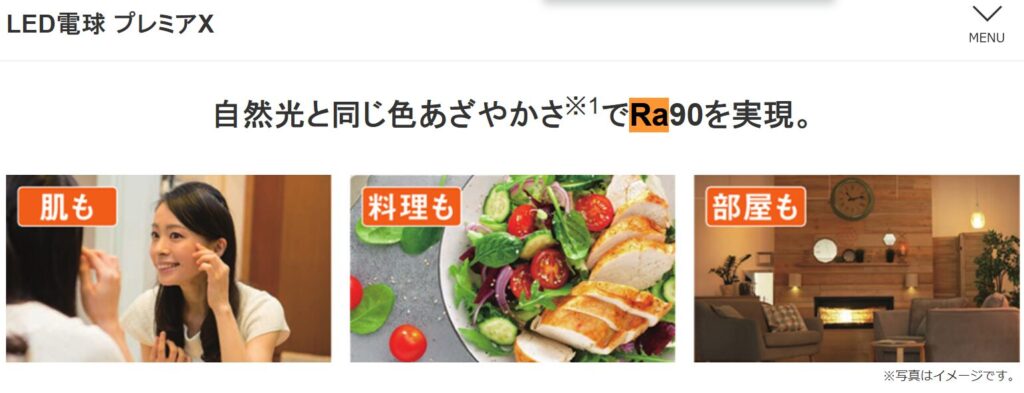 大手メーカーの製品、例えばパナソニックの「プレミアX」シリーズなどはRa90以上という非常に高い数値を持っていて、食事が美味しそうに見えたり、お化粧の色が正確に分かったりします。