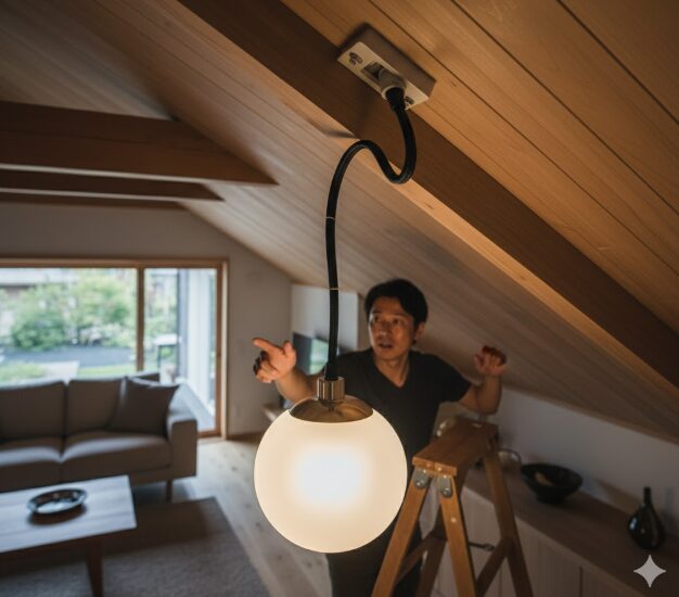 勾配天井のペンダントライト設置で最も避けたいのは、照明器具のコードに重大な負担がかかる状態です。開放的な空間ゆえに、照明計画での失敗が大きな後悔につながることもあります。
