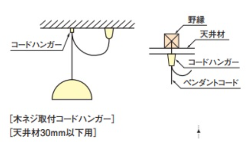 - コードハンガーの取り付けには、天井裏の「下地(構造材)」がある場所を選ぶ必要があります。石膏ボードだけの場所に取り付けると、照明の重みでハンガーごと抜け落ちる危険があります。