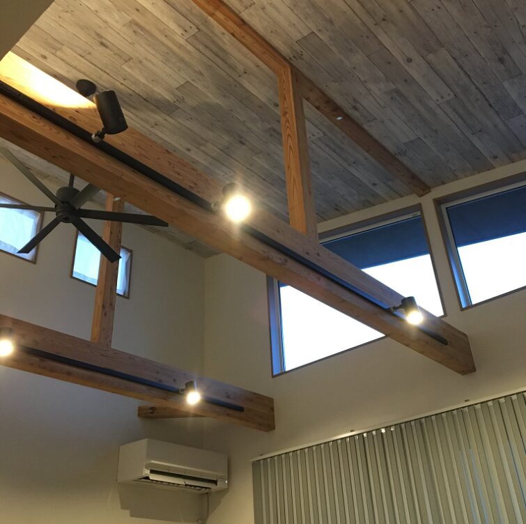 勾配天井の空間に、あえて構造材である「見せ梁(みせはり)」を露出させるデザインは人気があります。この梁は、照明を設置する絶好のポイントになります。