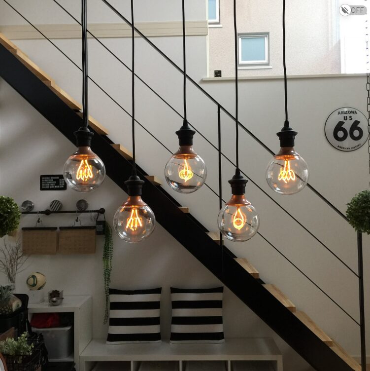 - 梁にペンダントライトのコードをラフに巻き付けたり、複数のライトを吊り下げたりして、立体感を演出する。