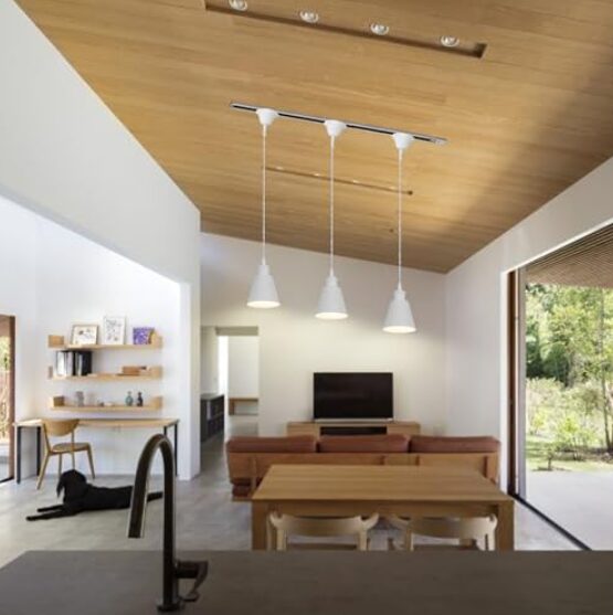 もう一つは専用の吊り下げ金具(パイプなど)を使用して、傾斜した天井からレールを「水平」に吊り下げる方法です。この方法なら、一般的な(傾斜非対応の)ペンダントライトプラグをそのまま使用できますが、天井からレールが浮いた状態になるため、より存在感が出ます。