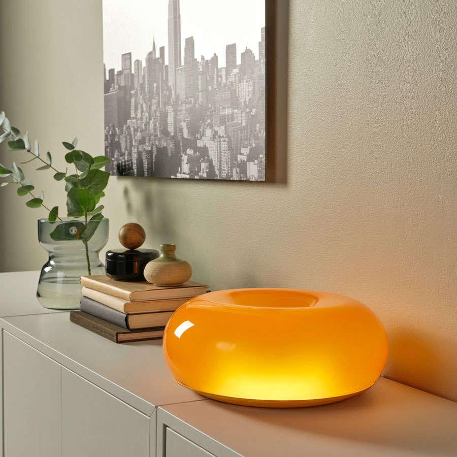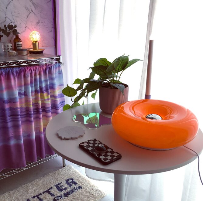 公式な製品名は非常にシンプルですが、ファンの間ではその見た目から親しみを込めて「ドーナツランプ」と呼ばれています。オレンジ色の半透明なガラスで作られたこのランプは、まるで夕日が部屋の中に留まっているかのような、濃密で温かい光を放ちます。