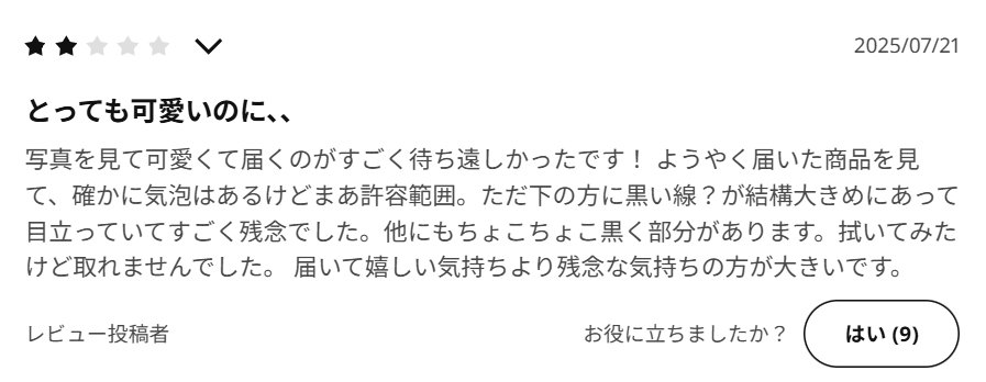 一方で、リアルな口コミの中には注意すべき点もいくつか挙げられています。最も多いのは、やはり「ガラスの個体差」についてです。手作業に近い工程で作られているためか、ガラス内部に小さな気泡が入っていたり、オレンジ色の濃淡にわずかなムラがあったりすることがあります。